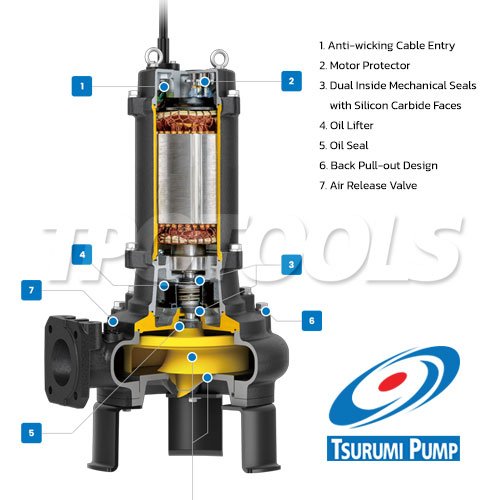 "TSURUMI" 100BN43.7 ปั๊มแช่สูบน้ำเสียชนิดใบพัดบดขยะ ท่อ 4 นิ้ว 5 แรงม้า ส่งสูง 15.5 เมตร 380V เหมาะสำหรับน้ำเสียของแข็ง หรือวัสดุเส้นใย